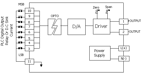 D To A Converter DA 98 จะรับสัญญาณ Digital จาก Digital Output ของ PLC ในรูปของ Binary Code แปลงเป็นค่า Analog (0 to 10 VDC, 4 to 20 mA, 1 to 5 VDC) อุปกรณ์ DA98 ช่วยให้สามารถใช้ Digital Output ของ PCL ควบคุมสัญญาณ Analog ได้ โดยไม่จำเป็นต้องใช้ Analog Output ของ PLC